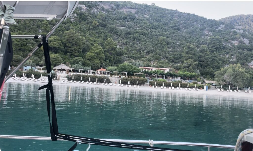 Schon gleich können wir unter voller Besegelung 5-6 kn erreichen! Wer hätte das bei diesem angekündigten „Nullerwind“ gedacht? Schnell erreichen wir Skopelos und die schöne Limnonari-Bucht, mit einem schönen Strand, der allerdings touristisch ausgelegt ist mit Popmusikberieselung und schönen Strandliegen. Nicht übermäßig viele Badegäste vergnügen sich. Wir finden einen guten Ankerplatz auf Sand. Außer uns liegen noch drei Jachten neben uns. Der Wind kommt aus Süd mit einigem Schwell. Aber das Badevergnügen siegt! Im Laufe des Nachmittags kommen noch einige Jachten zum Badestopp und wir sind froh noch rechtzeitig gekommen zu sein.