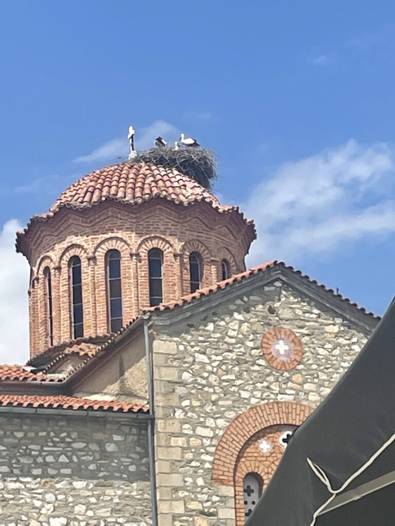 Es geht weiter durch Berge und Wälder. Wir wähnen uns eher in den Alpen! Und wieder die vielen Getreidefelder und Obstplantagen. Wir sind sehr lange unterwegs. Der Olymp grüßt mal mehr, mal weniger umwölkt herüber. Nach langer Fahrt erreichen wir Elassona, wo wir das berühmte uralte Kloster besichtigen wollen. Leider (natürlich!) haben sämtliche Geschäfte geschlossen. Wir brauchen nämlich dringend einen 5-Liter-Eimer für die Klospülung, (den WD leider hat über Bord gehen lassen im Platzregen vorgestern) doch auch hier werden wir (natürlich!) nicht fündig. Dafür aber können wir das Schauspiel einer Storchenfamilie bewundern, die auf dem Kirchendach ihre Jungen füttern.