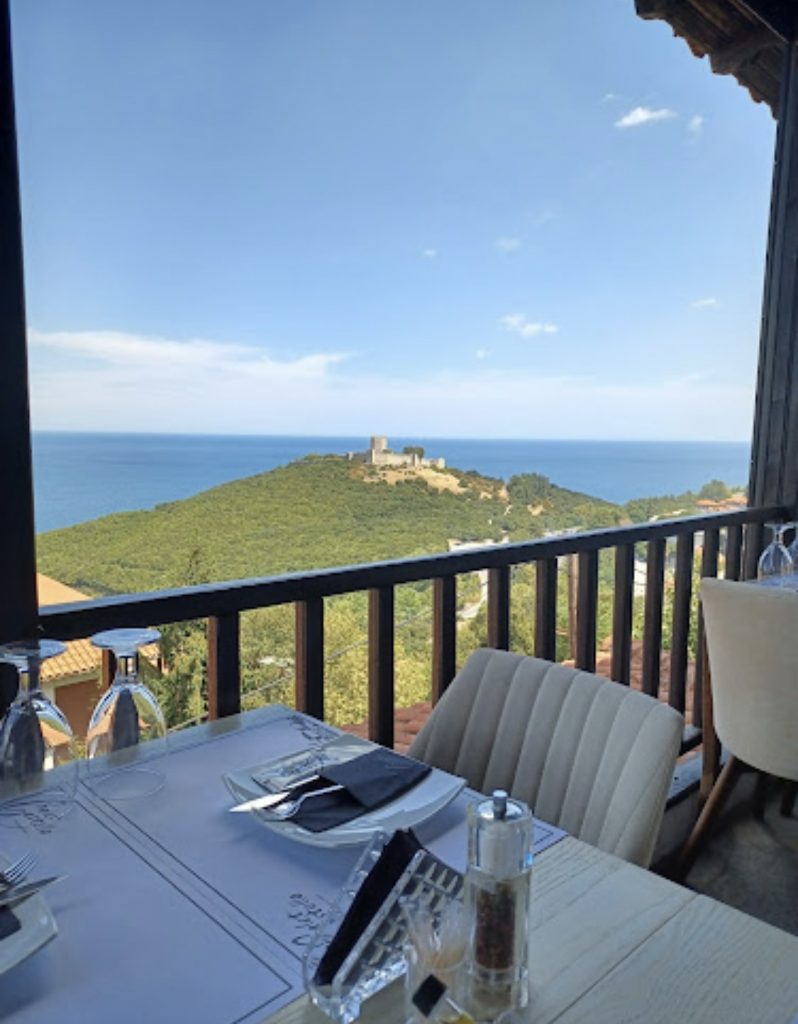 Bevor wir zum Boot zurückkehren, entdecken wir im oberen Dorf von Platamonas ein in den Berg hineingebautes todschickes Restaurant, das Chalet Castello. Man kann die obere Terrasse mit steiler Treppe oder aber mit dem Aufzug erreichen. Oben bietet sich ein umwerfender Blick auf die Burg und die Tiefebene bis nach Katerini! Wir trinken „nur“ einen Orangensaft, werden aber total verwöhnt mit zusätzlichen Gästeküchlein und Melonenlikör!