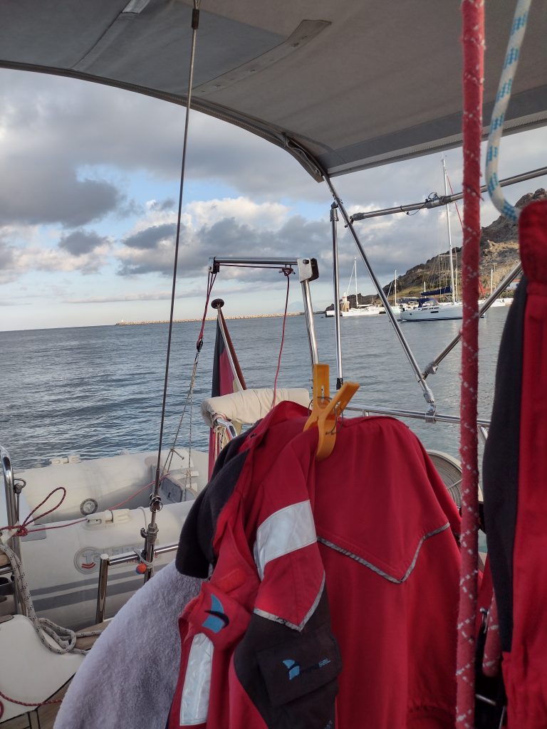 Gegen 18.00 setzt langsam der Wind ein, der minütlich stärker wird und gegen 20.00 uns richtig auf die Nase bläst. Zum Glück liegt unsere Anker stabil. Als dann um 22.00 auch noch Regen einsetzt wird uns klar, dass wir in dieser kommenden Nacht nicht schlafen werden. Nach Mitternacht stürmt und regnet es unbarmherzig, die Nachbarlieger kommen uns andauernd zu nahe, so dass WD – inzwischen im Regenzeug – nach draußen gehen muss um eventuelles Abdriften zu beobachten und etwaige Kollisionen zu verhindern. Gu erfasst inzwischen die eiskalte Panik, steht aber trotzdem auch im Anorak bereit im Falle eines Falles den Motor zu starten. Insgesamt sind wir furchtbar aufgeregt bei diesen tosenden Geräuschen der sich aufbauenden Welle und des Windes in Mast und Wanten, dass wir völlig erschöpft immer wieder unser schützendes Deckshaus aufsuchen und durch die beschlagenen Scheiben beobachten, ob die Nachbarn uns nicht zu nahe kommen. ABER UNSER ANKER HÄLT! Eine furchtbare Nacht, in der wir erst gegen 4.30 etwas Ruhe im Liegen finden können, denn obwohl sich der Wind legt, sind die Wellen noch dermaßen hoch, dass White Satin hin und her schwankt und an sowas wie Schlaf nicht zu denken ist. Bei Sonnenaufgang ist der Regen verschwunden. So können wir dem ganzen Horror zumindest für White Satin auch etwas Positives abgewinnen: sie hat eine Süßwasserdusche ersten Ranges bekommen!