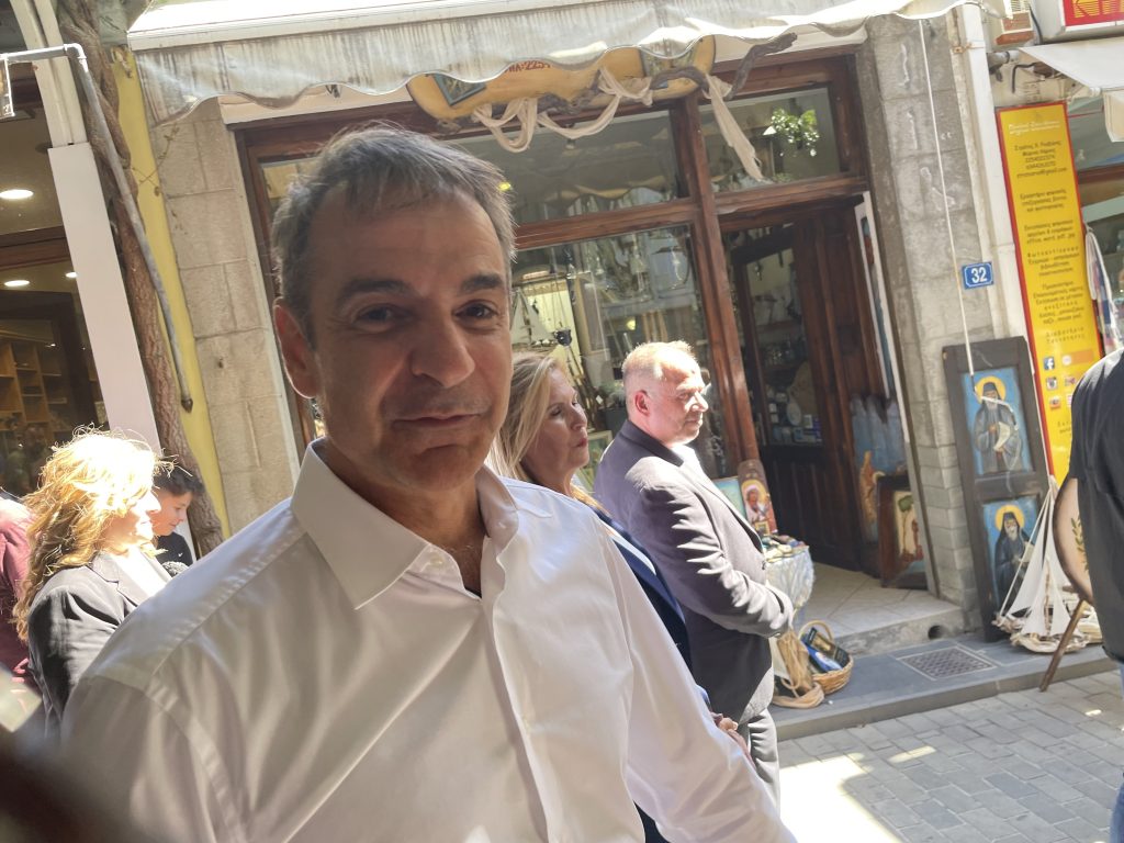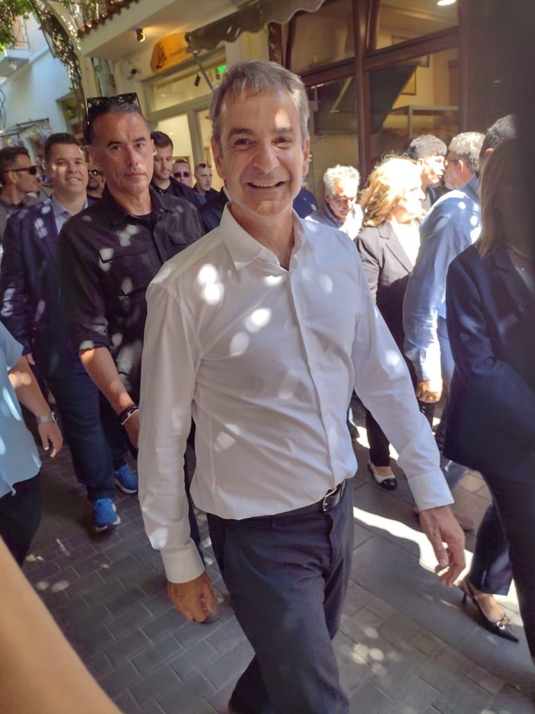 Myrina ist in Aufruhr! Überall Polizei, die Straßen sind gesperrt, die TV-Kameras bereit. Was ist da los? Wir gehen mit der Menge Richtung Einkaufsstraße. Ein Mann mit blütenweißem Oberhemd und einer großen Entourage scheint der Grund zu sein. Wir stehen am Rand und beobachten das ganze, und da steuert Mitsotakis direkt auf uns zu, gibt und die Hand und fragt (in korrektem Englisch!): “Where are you from? First time in Greece? Welcome!” Und weiter zieht der ganze Zug, der Minister nimmt überall auf dem Weg zum Rathaus ein Bad in der Menge. Da hört man nur Applaus, nicht ein Buhruf oder kritisches Wort! Wie wir später nachlesen können hat er auch nur gutes im Gepäck für die Drei-Insel-Verwaltung von Efstratios, Limnos und Lesbos: Steuererleichterungen und finanzielle Unterstützung der Primärbereiche.